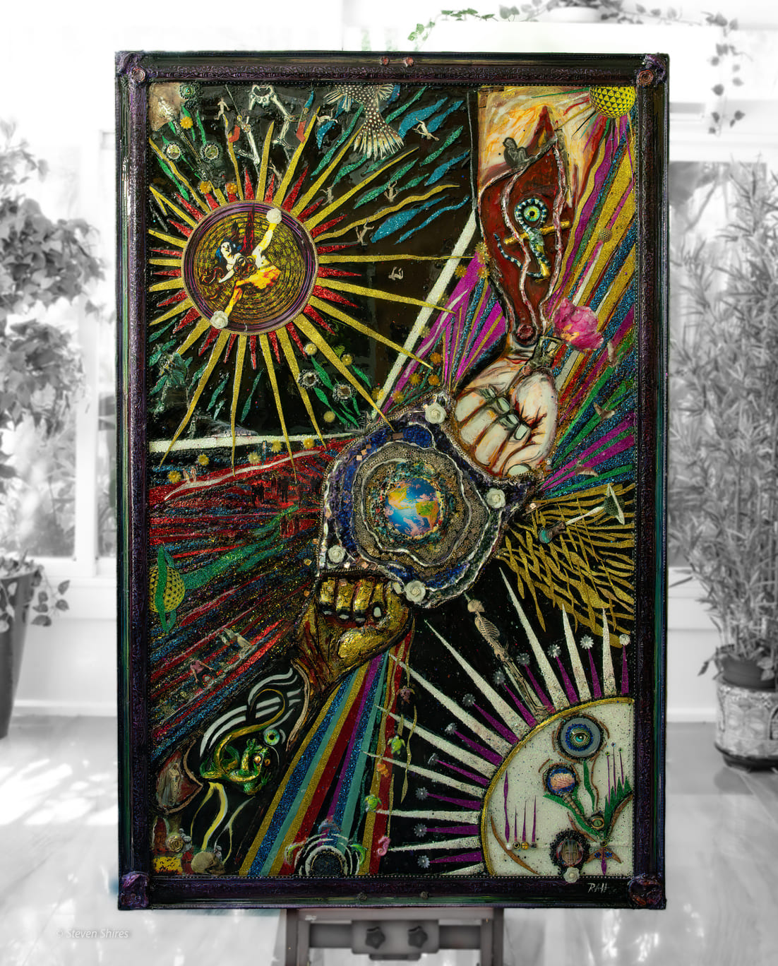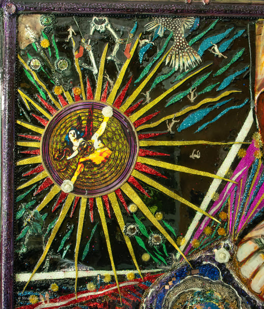 Medium: Acrylics, foam sculpting, various art papers, collage, found materials.
