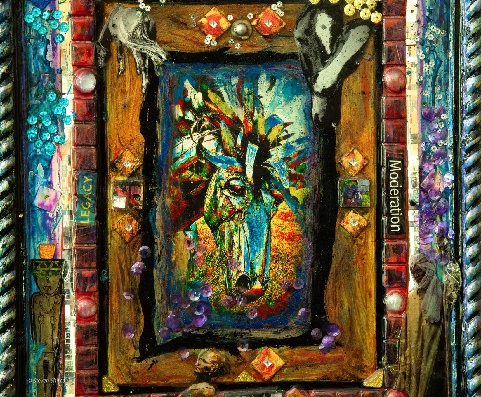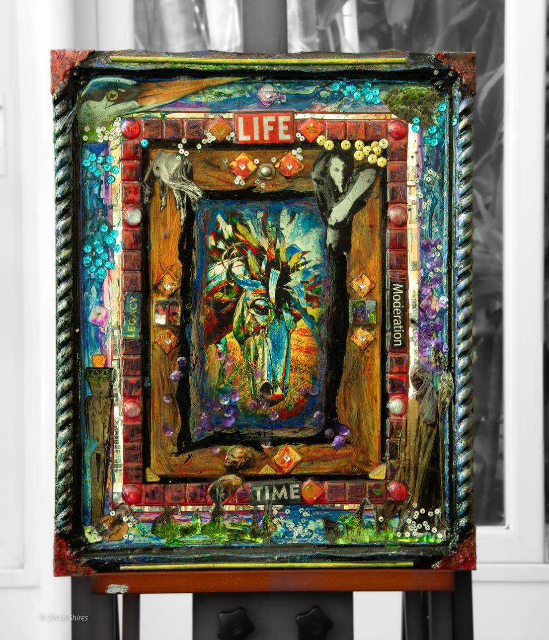 Medium: Acrylics, hand-made objects, glass and ceramic pieces, and found objects on matte board.