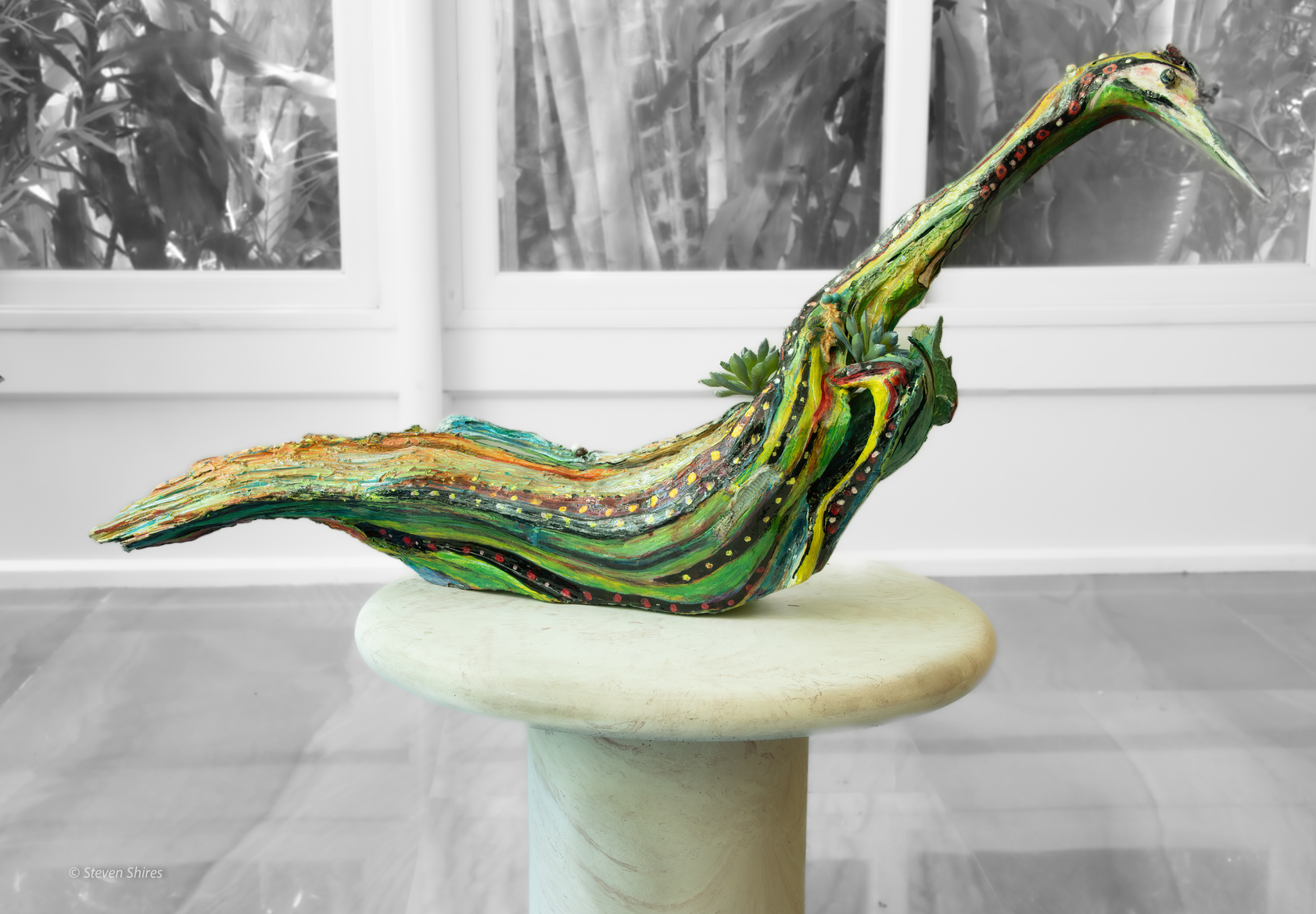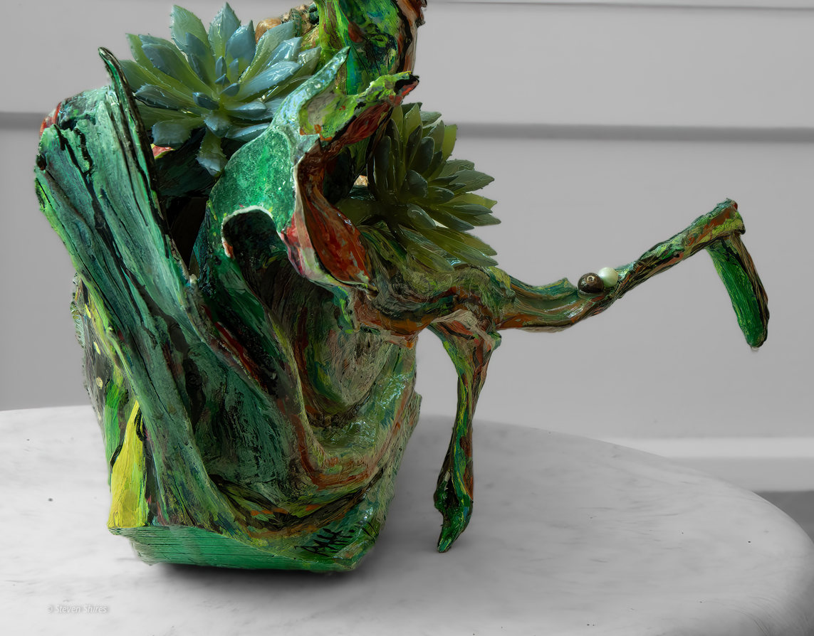 Medium: Acrylics, beads, found pieces, artificial foliage, and driftwood.