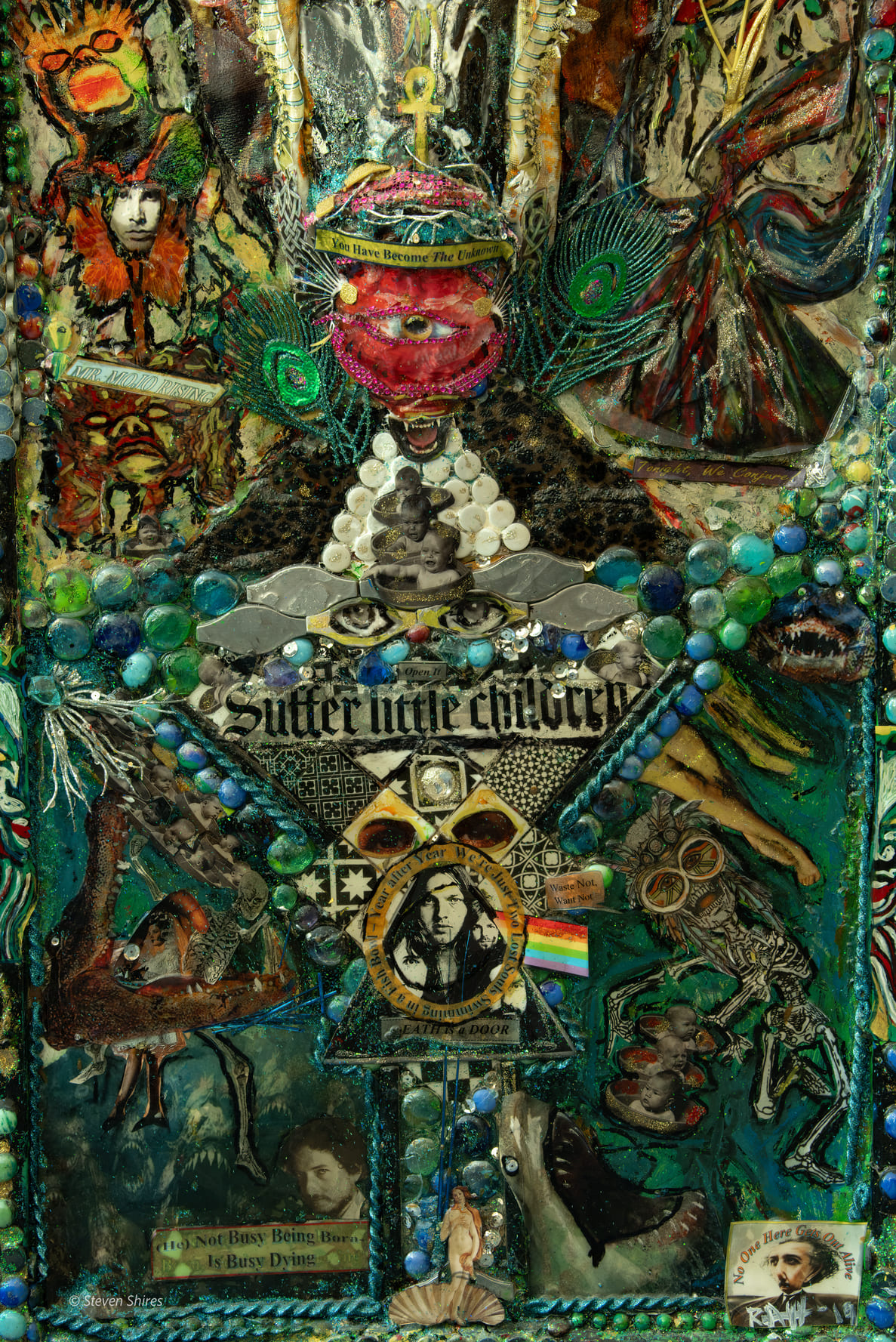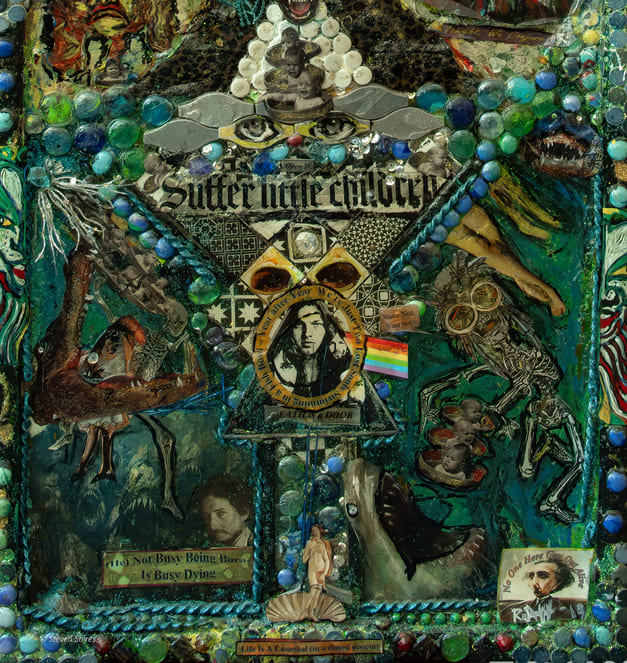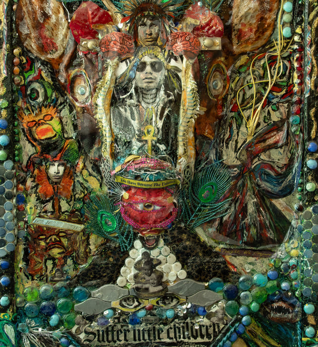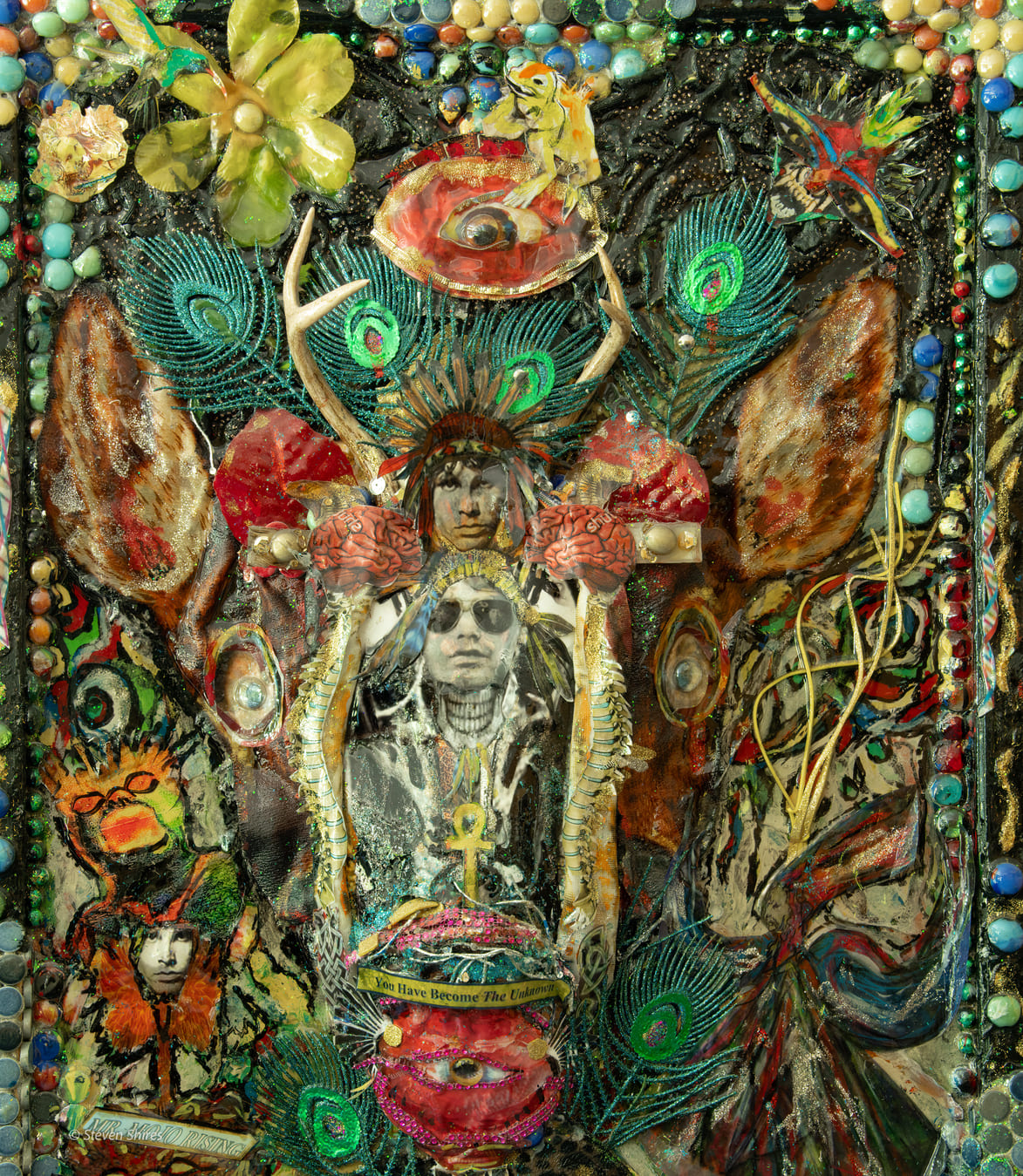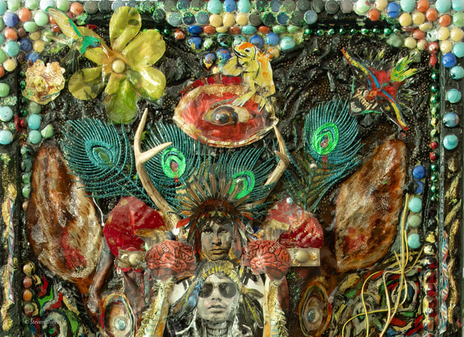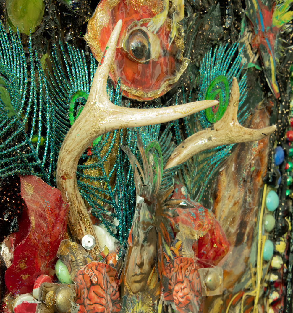 Medium: Acrylics, sculpting foam, collage, authentic deer antlers, found objects on canvas, and wooden framing.