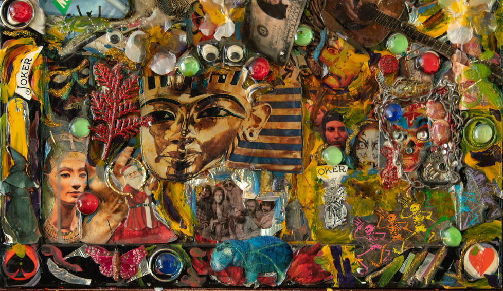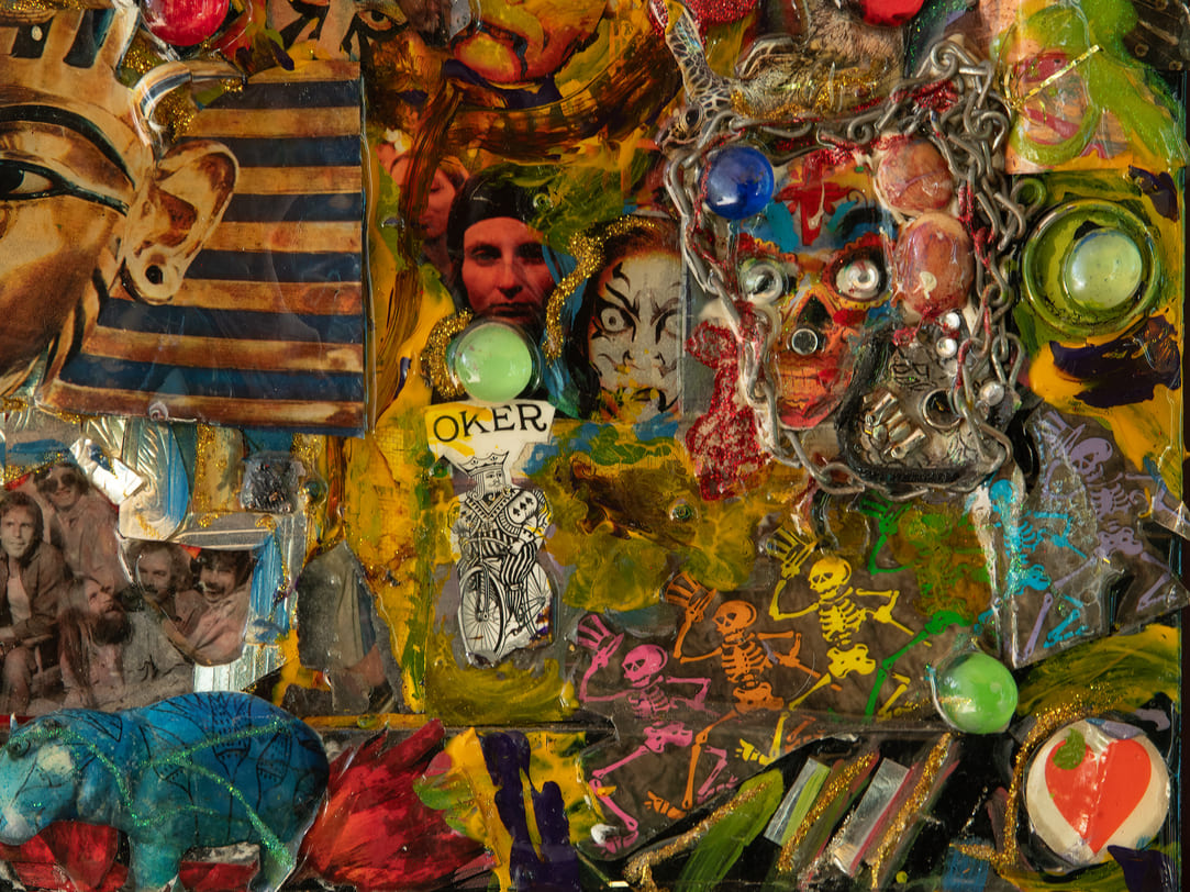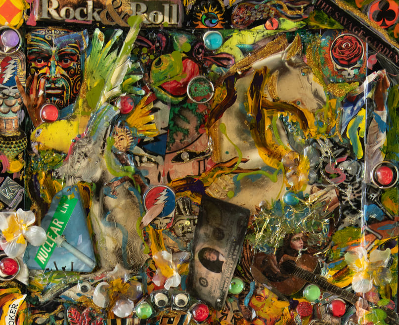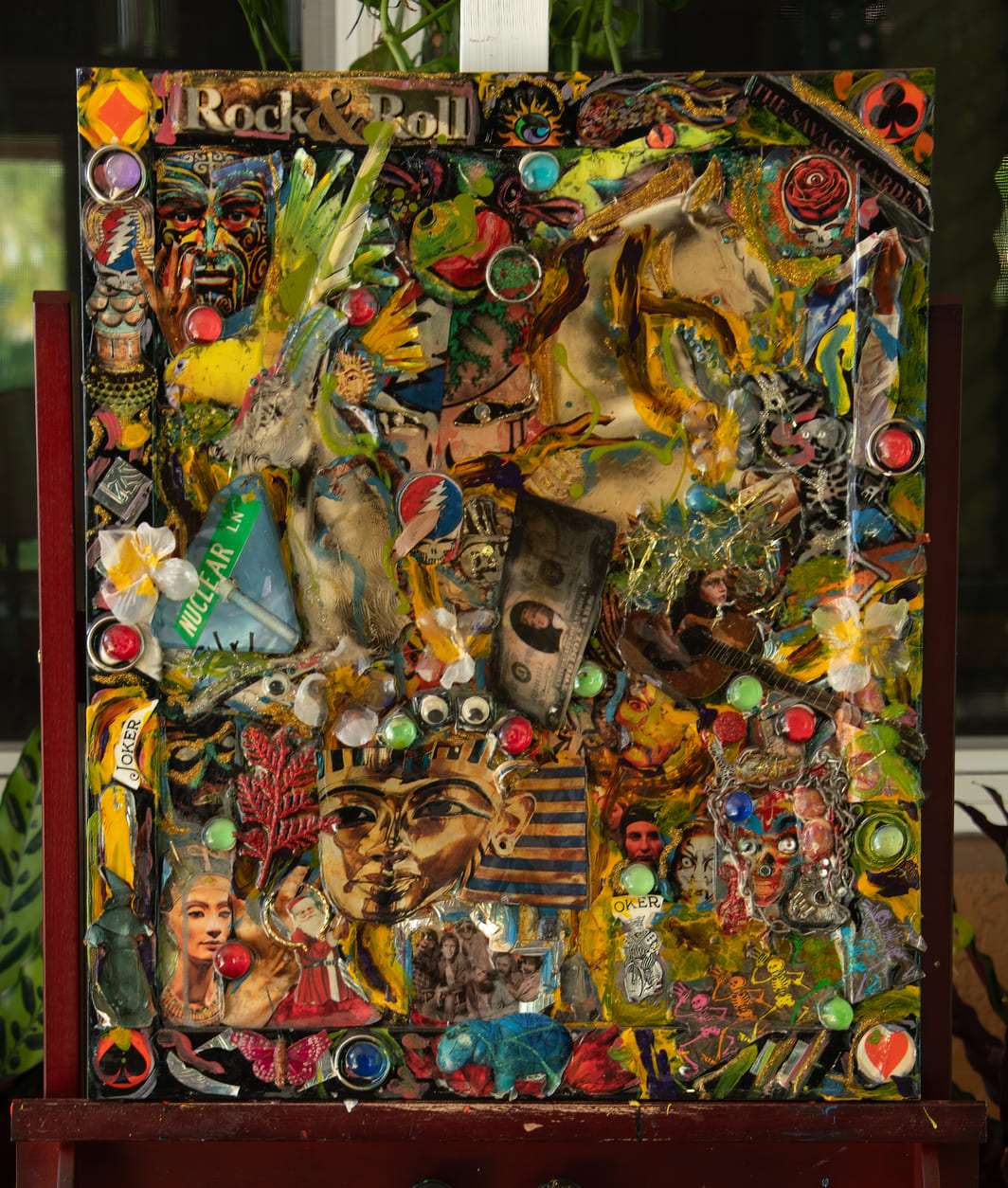 “Rock & Roll” (2016) is a visual amplifier—an ecstatic collision of pop myth, rebellion, and spectacle packed into a single, glittering riot. Built as a collage on matte board, the piece layers icons, creatures, masks, money, and jokes like a fever-dream scrapbook: a horse charges through the noise while a bright bird flares across the scene, with faces and symbols surfacing and disappearing amidst paint splashes and embedded shine.