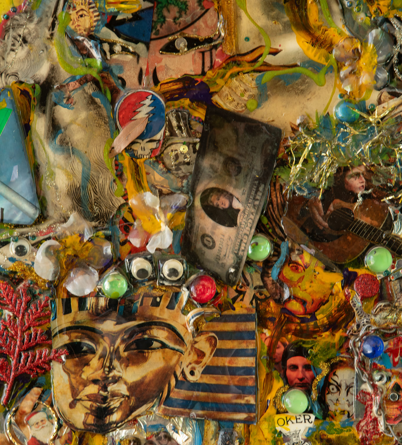It feels like a backstage wall covered in posters and prayers—wild, funny, aggressive, and oddly tender in its chaos. Finished in glossy epoxy, everything is fused into a “museum-of-moments” depth that is loud on purpose and unforgettable by design.