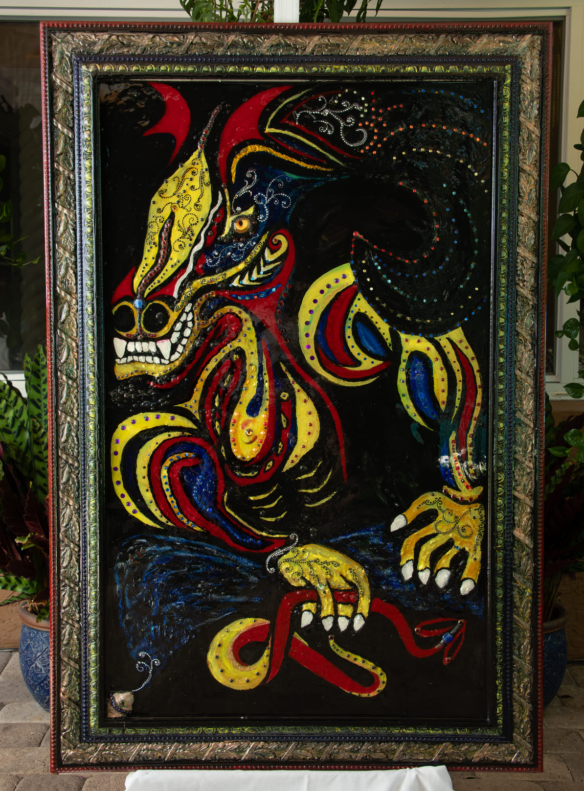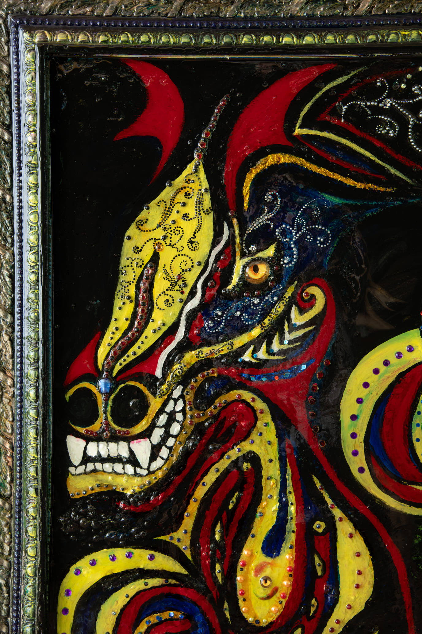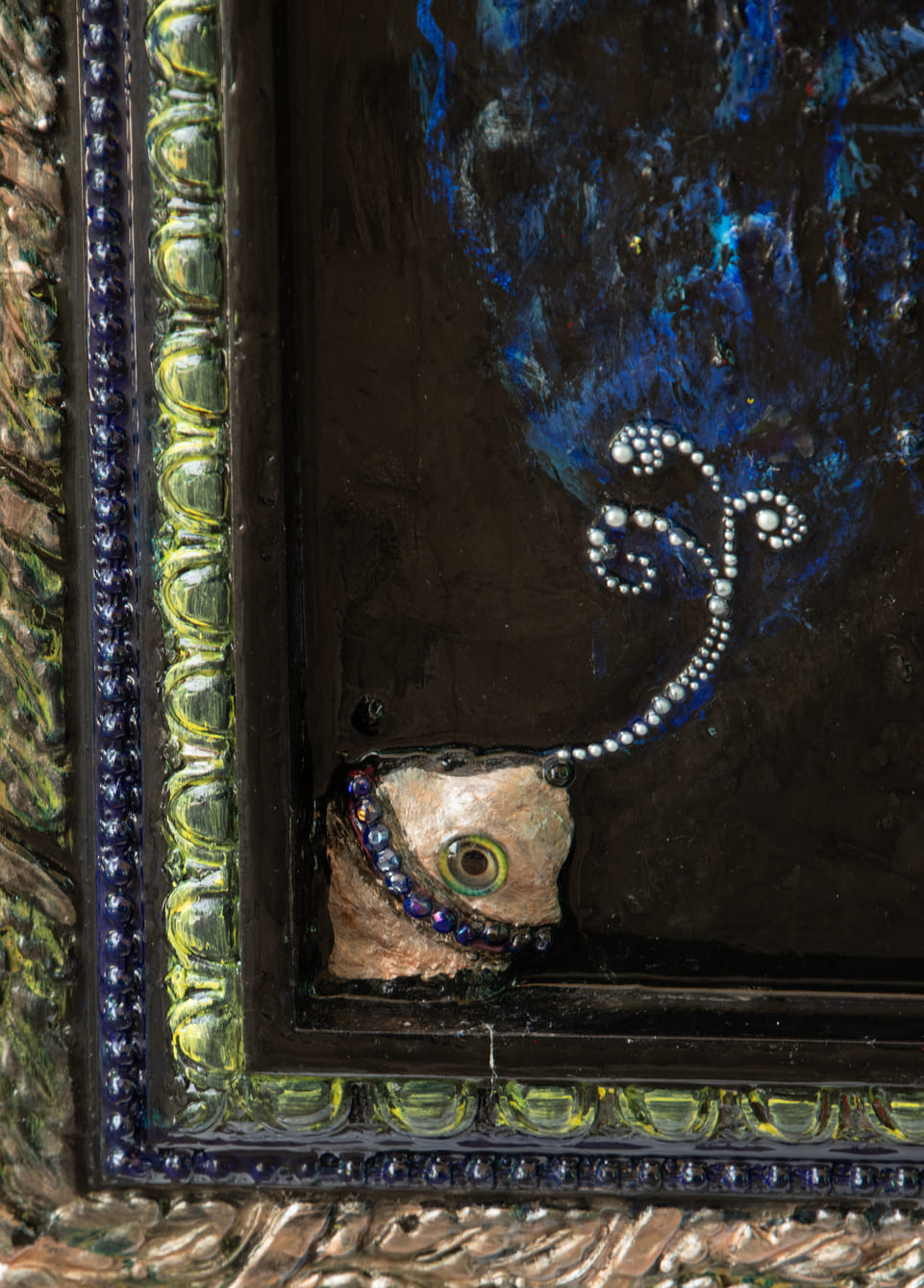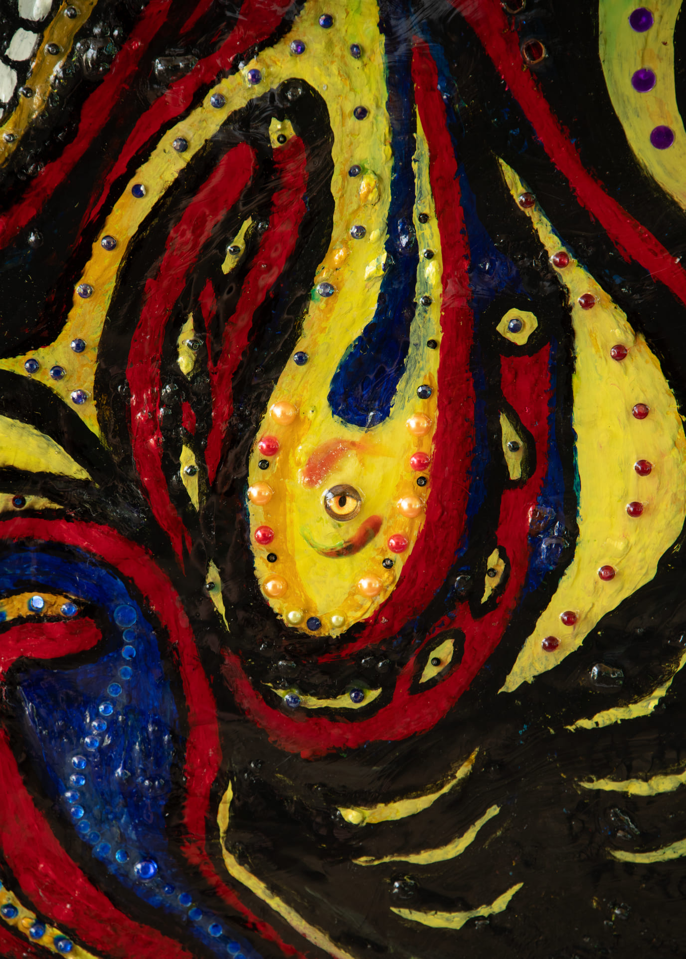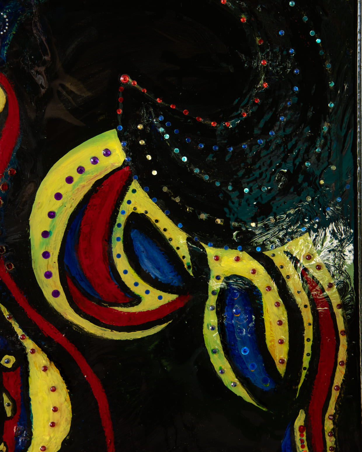 Medium: Acrylics, rhinestones, and glass beads on canvas.