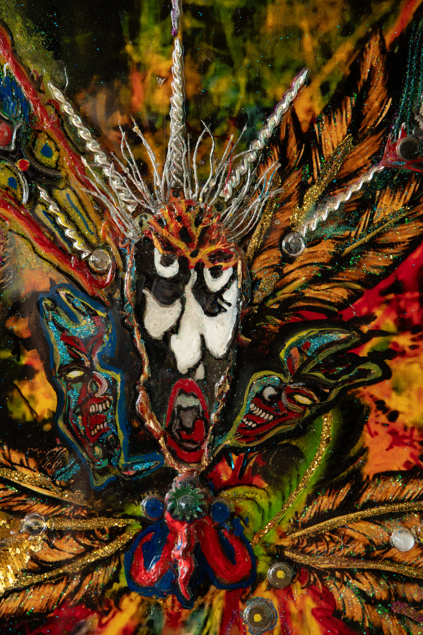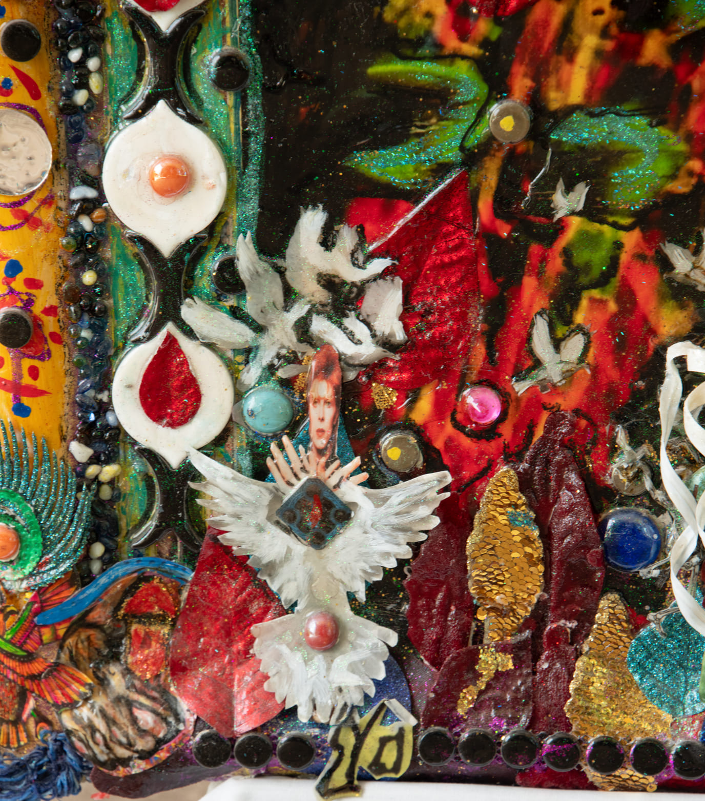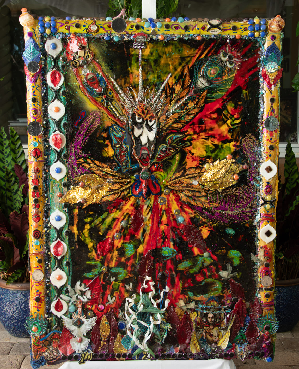 Medium: Acrylics on canvas, collage, found objects, glass, plastic ceramic & mirror pieces, feathers.