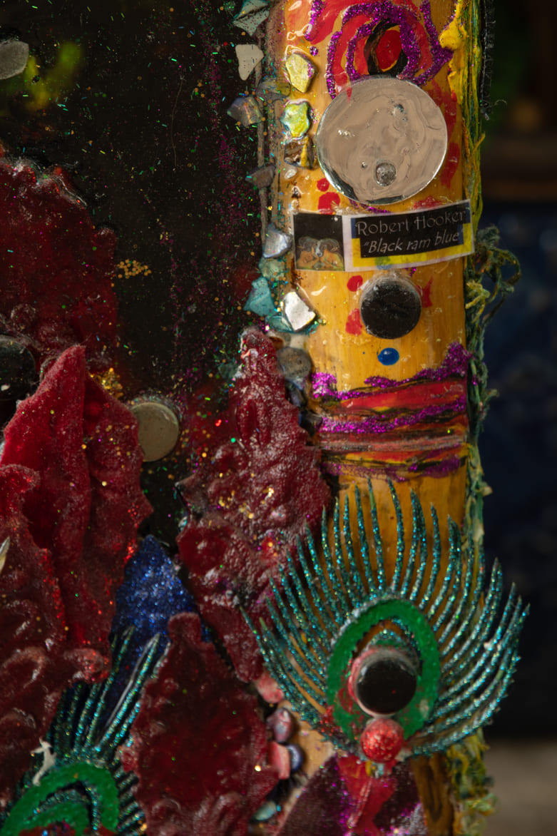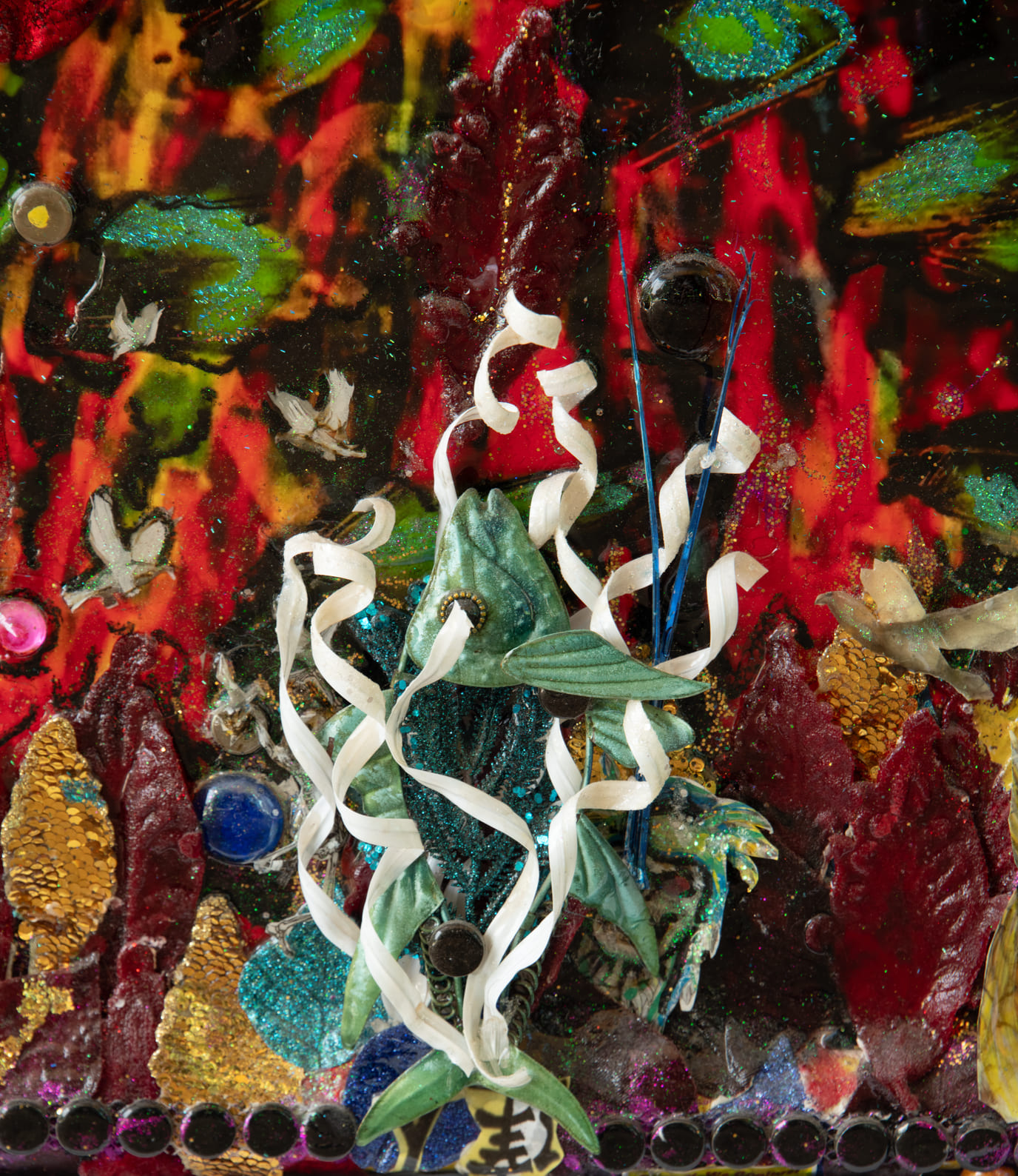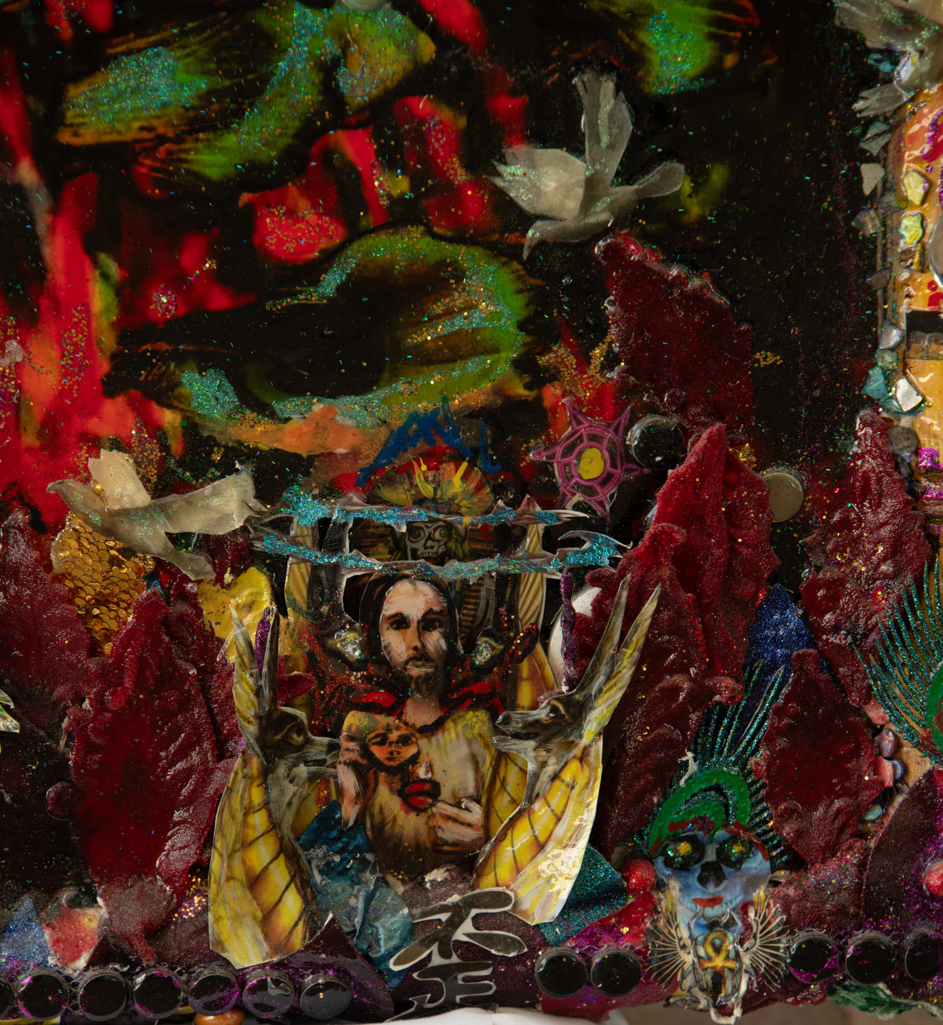 Medium: Acrylics on canvas, collage, found objects, glass, plastic ceramic & mirror pieces, feathers.
