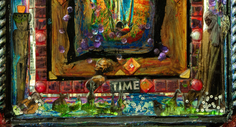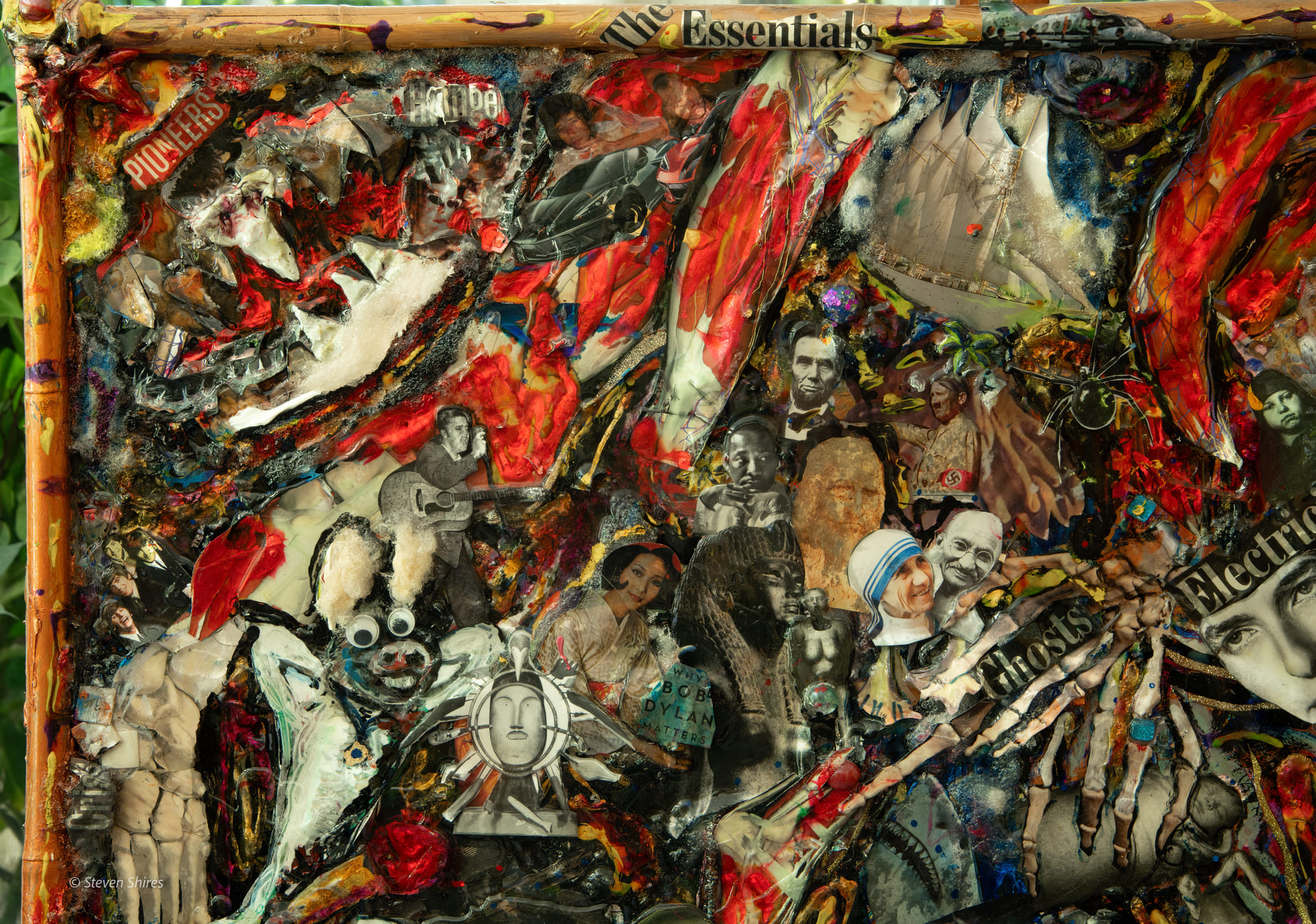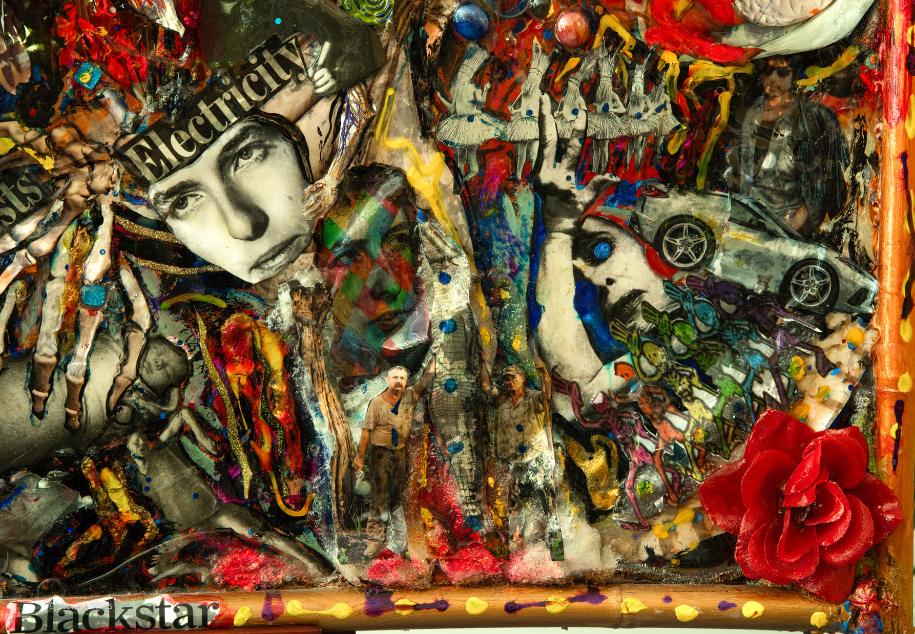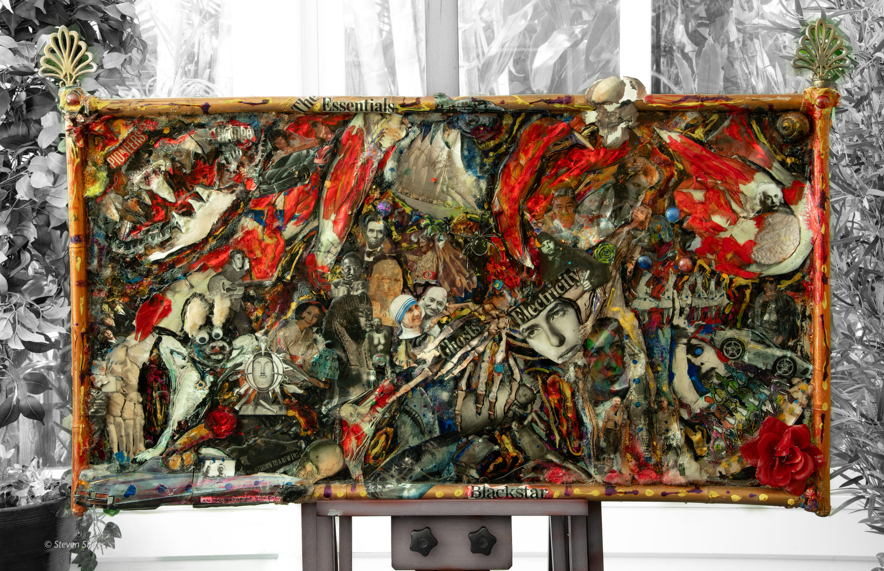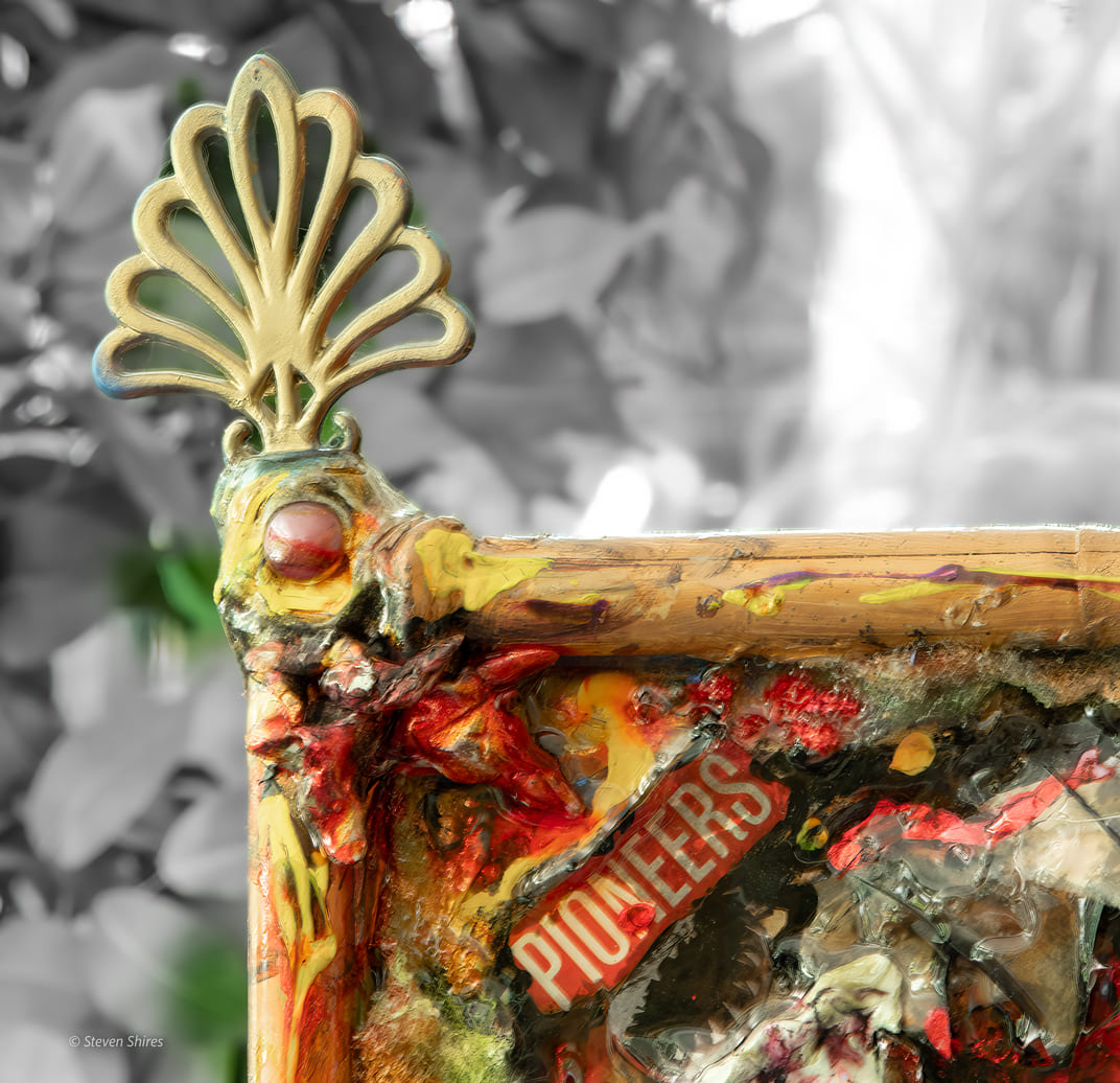 The surface is built up with sculpting foam and found objects, then sealed in epoxy so the chaos feels frozen in amber—beautiful, disturbing, and strangely distant. Ornamental details on the frame contrast with the raw imagery inside, underscoring the tension between spectacle and tragedy while inviting reflection on the stories that never get fully told.